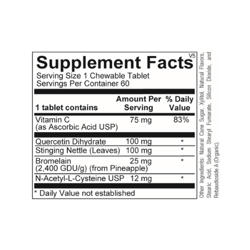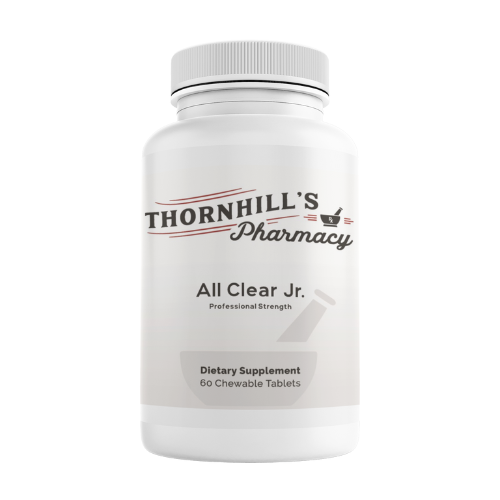 All Clear Jr.™ includes quercetin, a powerful flavonoid to support healthy histamine levels. It supplies bromelain to enhance the absorption of quercetin and to support mucosal tissue health and stinging nettles leaf to balance hyper-immune response. N-acetyl cysteine clears the airways by promoting normal viscosity of mucus. This unique nutritional combination safely promotes healthy nasal and sinus passages for children with elevated histamine and respiratory irritation.